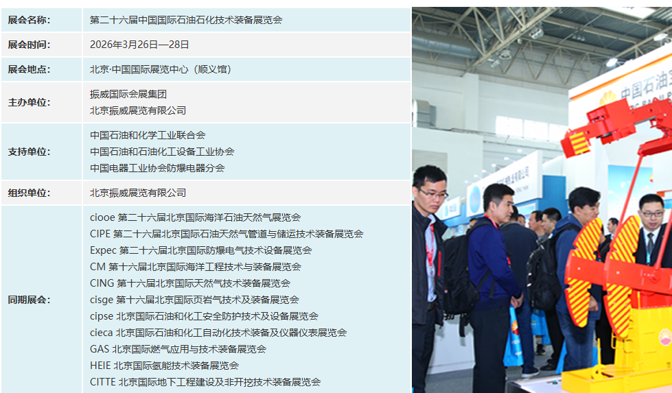 第二十六届中国国际石油石化技术装备展览会(cippe2026),将于2026年3月26日-28日在北京·中国国际展览中心(顺义馆)举办,欢迎您届时参观参展!